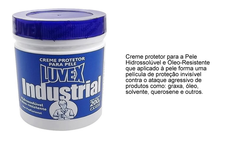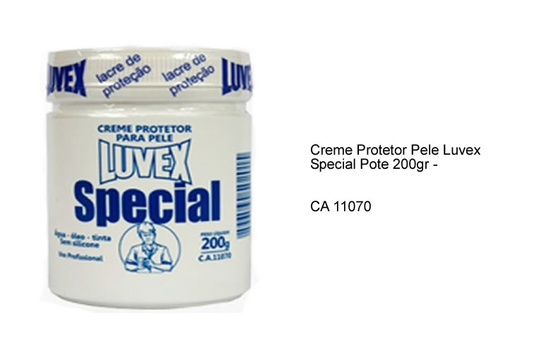 luvex special é um creme protetor para a pele, água,óleo,pintura e cola-resistente que, quando aplicado forma uma película de proteção contra o ataque agressivo de produtos químicos tais como tintas, solventes (querosene, aguarraz) e substâncias similares, óleos, graxas, cimentos, colas, pós, resinas e outros produtos . Além disso, permite uma fácil remoção das impurezas, com uma simples lavagem da pele. creme protetor tipo Grupo 3.