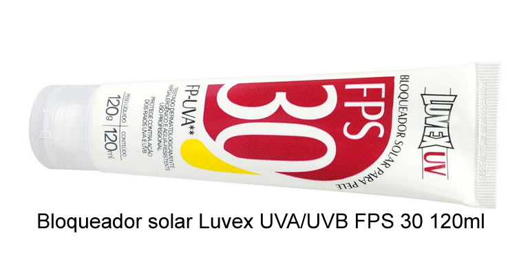 O BLOQUEADOR SOLAR Luvex UVA/UVB FPS 30 Luvex age contra a ação nociva dos raios ultravioletas dos tipos UVA e UVB emitidas pelas radiações solares, pelas radiações provenientes de trabalhos com soldas elétricas e de outras máquinas e equipamentos que emitam este tipo de radiações.
