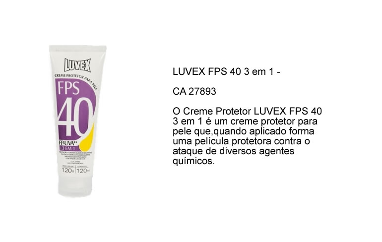 O Creme Protetor LUVEX FPS 40 3 em 1 é um creme protetor para pele que,quando aplicado forma uma película protetora contra o ataque de diversos agentes químicoscomo tolueno, xileno, n-hexano, cloreto de metileno, clorofórmio, perclororetileno, tricloroetileno, metiletilcetona, acetona, benzina, thinner, água-raz, gasolina, óleo mineral, óleodiesel, querosene. Também protege a pele dos efeitos nocivos das radiações UVA e UVB.