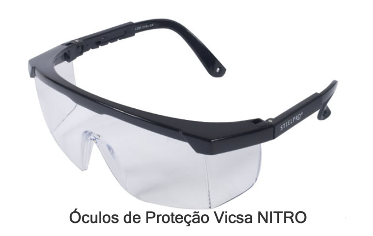 Óculos de proteção confeccionados em policarbonato ótico, proteção lateral e tratamento antirrisco. Armação em material plástico, hastes com regulagem de comprimento e cordão de segurança.