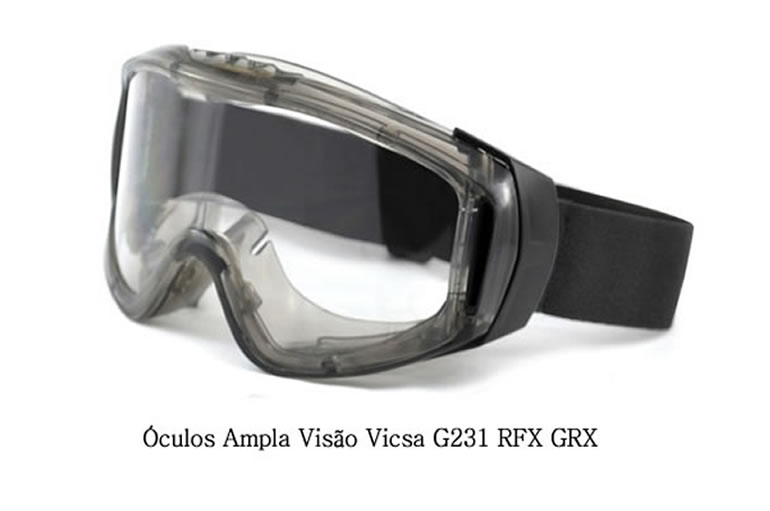 Óculos de segurança ampla visão, com lente de proteção em policarbonato 2,4mm de espessura, com ratamento anti-risco, antiembaçante e UV, ventilação indireta, armação em silicone e elástico de memoria ajustável. Acompanha bolsa em nylon para armazenagem.