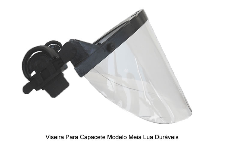 Viseira facial constituída de lente em policarbonato Modelo Meia Lua, disponível em diversas espessuras e tonalidades.Fixada através de adaptador de polietileno de alta densidade Para acoplar no Capacete Aba frontal.